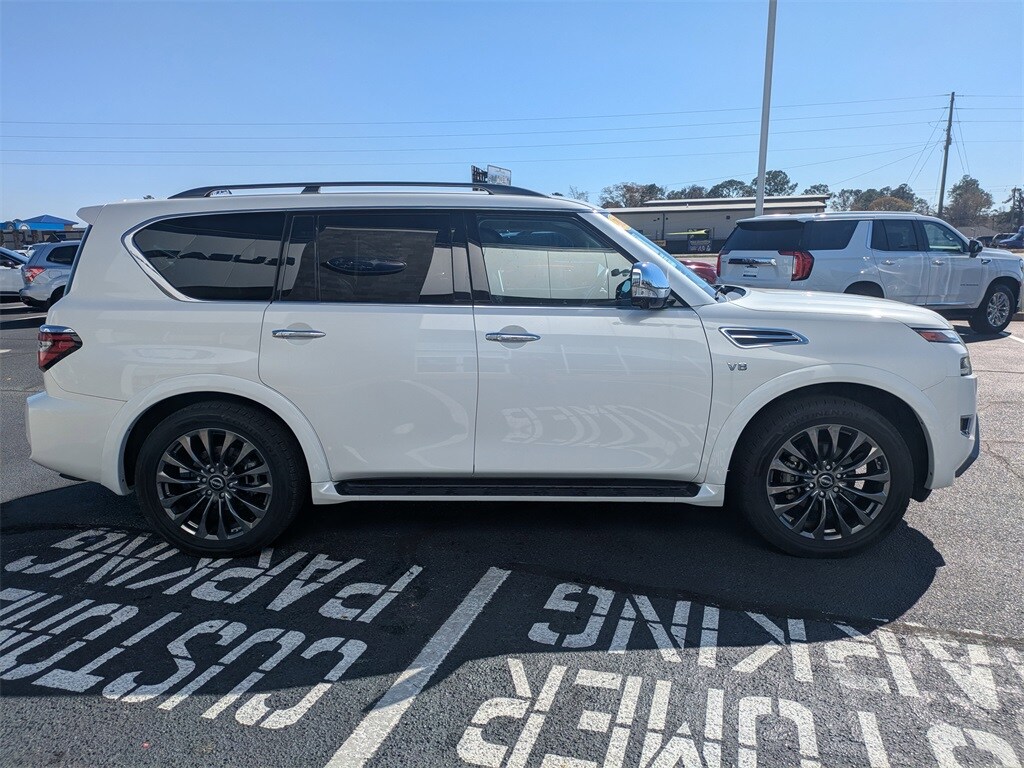 2021 Nissan Armada Platinum CLEAN CARFAX, NO ACCIDENTS, ONE OWNER, Armada Platinum, Aspen White Tricoat, Black Leather, 13 Speakers, 2.94 Axle Ratio, 2nd Row Captain's Chairs, 2nd Row Center Console w/Padded Armrest, 3rd Row Carpeted Floor Mats - Captain Seat, 3rd row seats: split-bench, 4-Wheel Disc Brakes, A/V remote, ABS brakes, Air Conditioning, AM/FM radio: SiriusXM, Anti-whiplash front head restraints, Auto High-beam Headlights, Auto tilt-away steering wheel, Auto-dimming door mirrors, Auto-dimming Rear-View mirror, Auto-leveling suspension, Automatic temperature control, Brake assist, Bumpers: body-color, Captain's Chairs Package, Climate-Controlled Front Bucket Seats, Delay-off headlights, Driver door bin, Driver vanity mirror, Dual front impact airbags, Dual front side impact airbags, Electronic Stability Control, Emergency communication system: NissanConnect Services, Exterior Parking Camera Rear, Four wheel independent suspension, Front anti-roll bar, Front Bucket Seats, Front Center Armrest, Front dual zone A/C, Front fog lights, Front reading lights, Fully automatic headlights, Garage door transmitter: HomeLink, Headphones, Heated door mirrors, Heated front seats, Heated rear seats, Heated steering wheel, Illuminated entry, Illuminated Kick Plates, Illuminated Scuff Plate, Leather Shift Knob, Low tire pressure warning, Memory seat, Navigation System, NissanConnect featuring Apple CarPlay and Android Auto, Occupant sensing airbag, Outside temperature display, Overhead airbag, Overhead console, Panic alarm, Passenger door bin, Passenger vanity mirror, Power door mirrors, Power driver seat, Power Liftgate, Power moonroof, Power passenger seat, Power steering, Power windows, Quilted Leather Seat Trim, Radio: NissanConnect w/SiriusXM, Rain sensing wipers, Rear air conditioning, Rear anti-roll bar, Rear reading lights, Rear seat center armrest, Rear window defroster, Rear window wiper, Reclining 3rd row seat, Remote keyless entry, Security system, Special Paint - Aspen White, Speed control, Speed-sensing steering, Speed-Sensitive Wipers, Split folding rear seat, Spoiler, Steering wheel memory, Steering wheel mounted audio controls, Tachometer, Telescoping steering wheel, Tilt steering wheel, Traction control, Trip computer, Turn signal indicator mirrors, Variably intermittent wipers, Ventilated front seats, Voltmeter, Wheels: 22" Machine-Faced w/Tinted Clear Coat, Armada Platinum, Aspen White Tricoat, Black Leather.